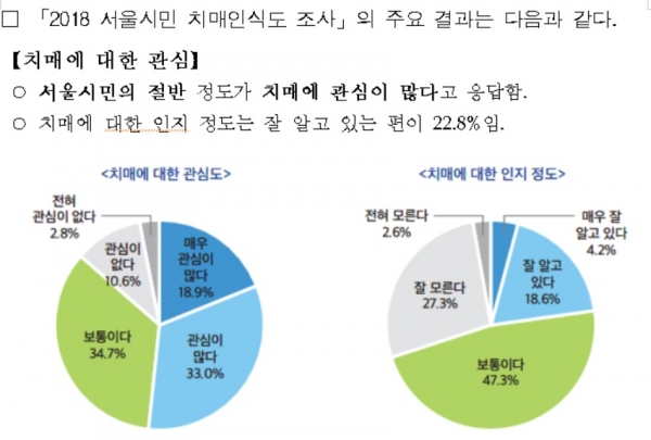 주요 결과를 보면 서울시민의 대부분이 치매에 관심이 있다고 긍정적으로 답변했다. 하지만 서울시민의 치매인식도 수준은 72.5점으로 여전히 낮았고 스스로 치매에 대해 잘 알고 있다는 응답은 22.8%에 불과했다.