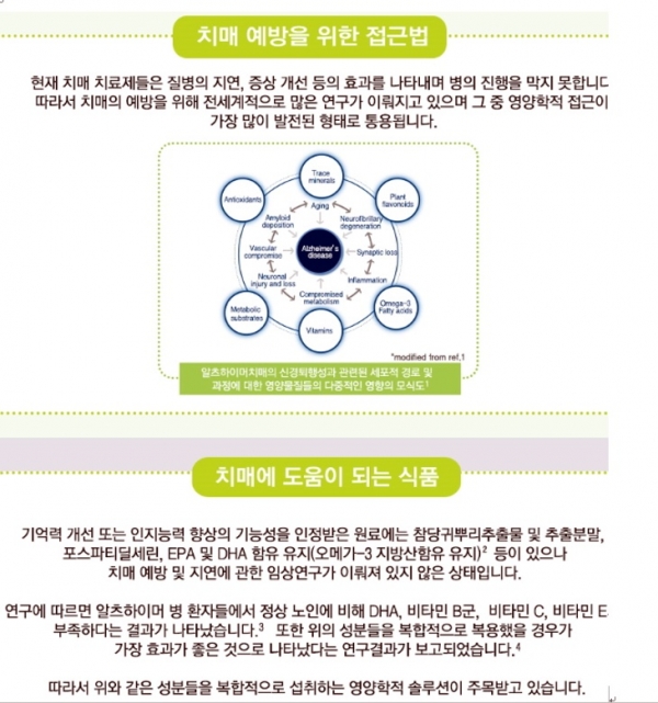 이외에도 유럽, 미국에서 1,332명의 환자를 대상으로 한 임상시험에서 인지기능을 향상시키는 효과가 확인됐지만 국내에서는 규제로 소비자에게 치매 예방효과를 홍보할 수 없어 의료진을 대상으로 제품을 소개할 예정이라고 발언했다는 점도 덧붙였다.