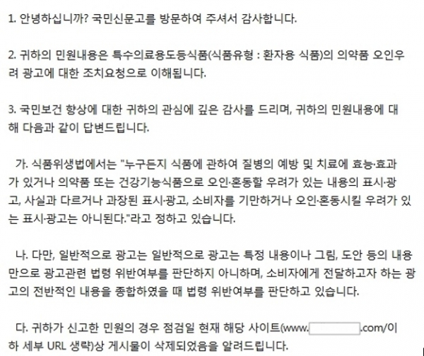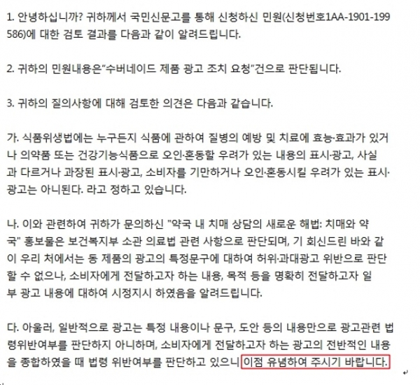 식약처는 1차 민원에서는 게시물 삭제에 문제가 없다는 답변을 냈고, 2차 민원에서는 일부광고에 대한 시정지시를 내렸다고 답변했지만 관련 시정조치는 어떤 것이 이뤄졌는지 찾아볼 수 없다고 설명이다.