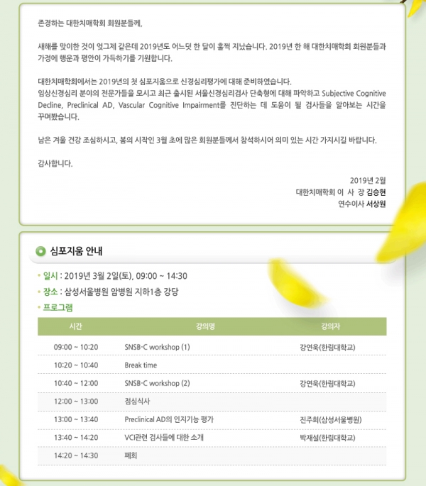 자세한 사항은 (http://www.dementia.or.kr//workshop/symposium/201902/) 통해 확인 가능하다.