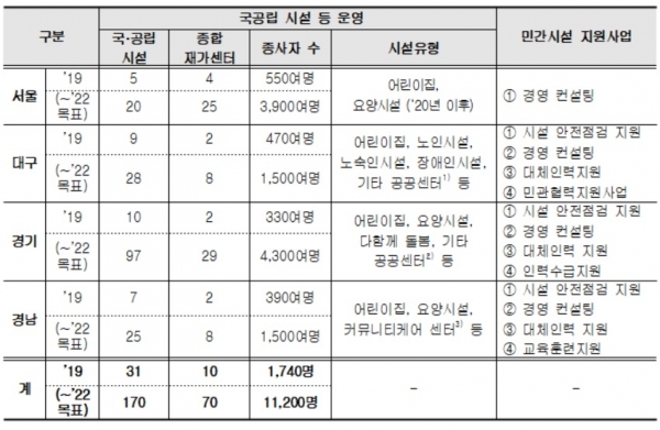 한편, 보건복지부는 2022년까지 17개 시‧도에 사회서비스원을 확충해 신축되는 국‧공립 어린이집 및 공립형 장기요양 기관 등 800여 개의 국‧공립 시설과 135개소의 종합재가센터를 운영하고, 최대 6만3000명의 서비스 제공인력 고용을 목표로 할 계획이다.