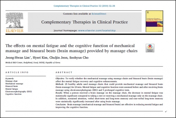 The effects on mental fatigue and the cognitive function of mechanical massage and binaural beats (brain massage) provided by massage chairs (안마의자를 이용한 마사지와 바이노럴 비트(브레인마사지)가 정신 피로와 인지기능에 미치는 영향). Lim JH, Kim H, Jeon C, Cho S. Complement Ther Clin Pract. 2018 Aug;32:32-38.