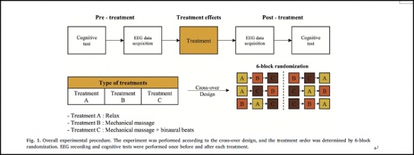 학술지에 게재된 연구는, 소규모인 25명의 건강한 성인을 대상으로, 치료 A(단순 이완), 치료 B(기계 마사지), 치료 C(기계 마사지 + 바이노럴 비트: 브레인마사지) 중에서 아래의 그림과 같이 한 사람에게 하루에 한 가지 치료를 20분씩 최소 3주간 시행했다.