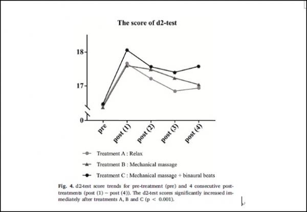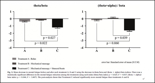 뇌파를 이용한 ‘정신 피로도’ 평가에서는 다음과 같이 치료 C가, 치료 A나 치료 B에 비해 치료 후에 ‘정신피로도’의 개선 효과를 보였다고 기술하고 있다.