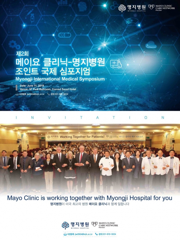 명지병원(이사장 이왕준)이 메이요 클리닉과의 협업관계를 맺은 1주년을 기념하여 제2회 메이요 클리닉 - 명지병원 조인트 국제 심포지엄을 개최한다.