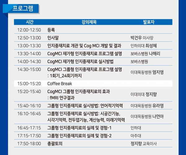 인지중재치료학회가 오는 8월 23일 13시부터 이대서울병원 컨벤션센터에서 Cog-MCI 워크샵을 개최한다.