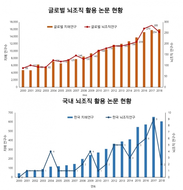인간 뇌조직 자원을 활용한 치매 분야 전체 연구논문을 '웹 오브 사이언스'(Web of Science)를 이용해 분석한 결과, 전세계 논문 건수는 2000년 88건에서 2018년 254건으로 증가했다. 연평균 6.4% 늘어난 수치다.