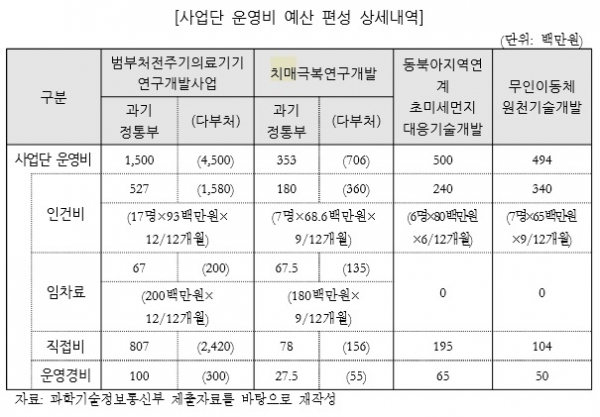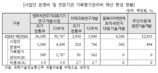 또 사업비 운영비 외에 연구관리 전문기관을 지원하기 위한 기획평가관리비가 별도 편성된 점도 지적을 받았다.