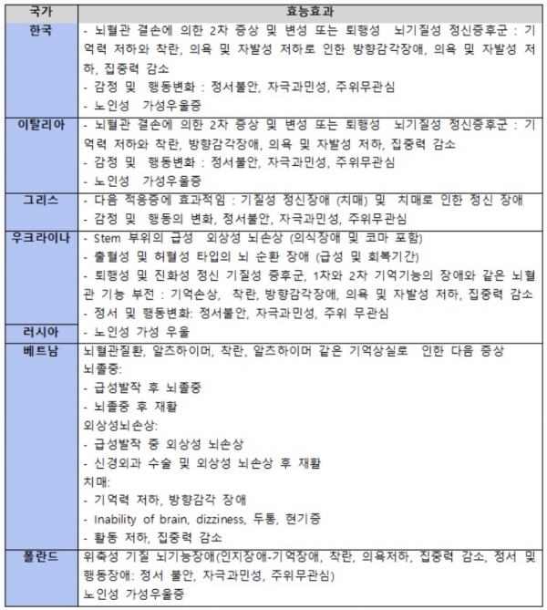 나라마다 적응증에는 조금씩 차이가 있지만 국내 적응증인 ▲뇌혈관 결손에 의한 2차 증상 및 변성 또는 퇴행성 뇌기질성 정신증후군: 기억력 저하와 착란, 의욕 및 자발성저하로 인한 방향감각장애, 의욕 및 자발성 저하, 집중력감소 ▲감정 및 행동변화: 정서불안, 자극과민성, 주위무관심 ▲노인성 가성우울증을 크게 벗어나지는 않는다.