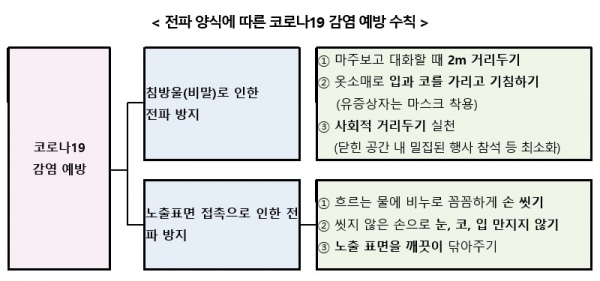 정부는 코로나19를 예방하기 위한 수칙을 정해 놨다. 대표적으로 ▲철저한 손 씻기 ▲기침 예절 지키기 ▲눈, 코, 입 만지지 않기 ▲마스크 착용 ▲사람 많은 곳 방문 자제 ▲유증상자와 접촉 피하기 등이 있다.