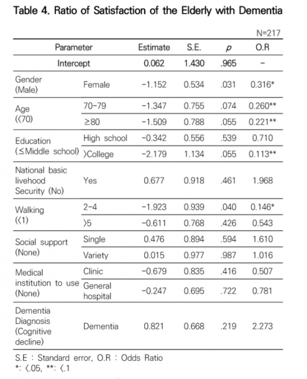 연령에서는 70대 미만 대 70대 승산비 1: 0.260, 70대 미만 대 80대 이상 승산비 1:0.221로 나타났다. 이는 70대 미만 만족도 100% 기준으로 70대 26.0%, 80대 이상 22.1%로서 각각 74%, 78%가 낮았다.