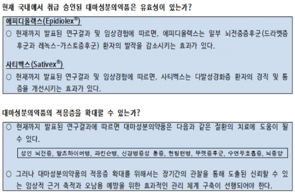 유효성의 경우 에피디올렉스는 일부 뇌전증증후군(드라벳증후군, 레녹스-가스토증후군) 환자의 발작을 감소시키는 효과가 있으며, 사티벡스는 다발성경화증 환자의 경직 및 통증을 개선시키는 효과가 있다는 데 의견을 같이했다.