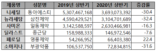 니세틸은 작년 상반기 53억원의 처방액을 기록했으나, 올해에는 37억원으로 전년 대비 30%나 줄었다. 뉴라세탐은 지난 상반기 31억원의 처방액으로 전년 46억원 대비 32%나 감소했다.