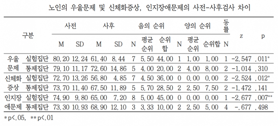신체화증상 실험집단은 사전검사 점수 평균 72.70점에서 사후검사 평균 56.80점으로 15.90점이 통계적으로 유의미하게 낮아졌다(z=-2.524, p<.05).