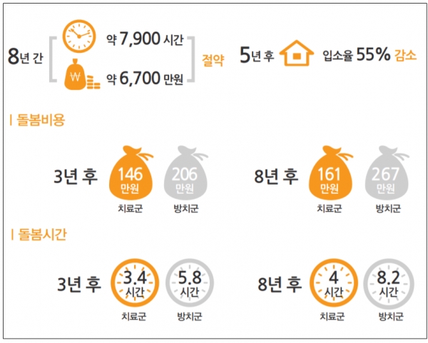 8년 후에는 방치군은 8.2시간, 치료군은 4시간으로 돌봄시간에 소요되는 시간이 두 배 이상 차이가 났다.