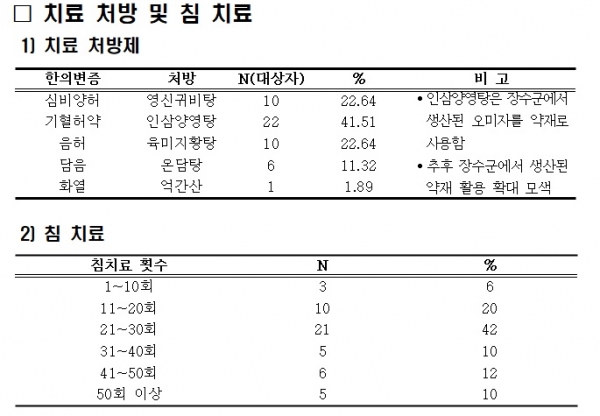 치매예방을 위한 치료 처방제를 보면 억간산의 경우 대상자 1명(1.89%)에 처방됐으며, 기타 약제의 경우 인삼영양탕(22명, 41.51%)이 가장 많은 비율을 차지했다.
