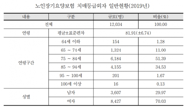 조사를 통해 파악된 치매등급외자는 총 1만2,034명이었으며, 여성 70.03%, 남성 29.97%로 여성의 비율이 압도적이었다.