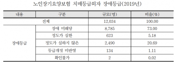 치매등급외자 중 장애가 없는 사례가 장애가 있는 사례보다 많았다. 장애등급이 없는 치매 등급외자가 8,785명(73%)으로 가장 많았으며, 장애정도가 심하지 않은 경증장애 2,490명(20.69%), 장애정도가 심한 중증장애 623명(5.18%) 등이었다.