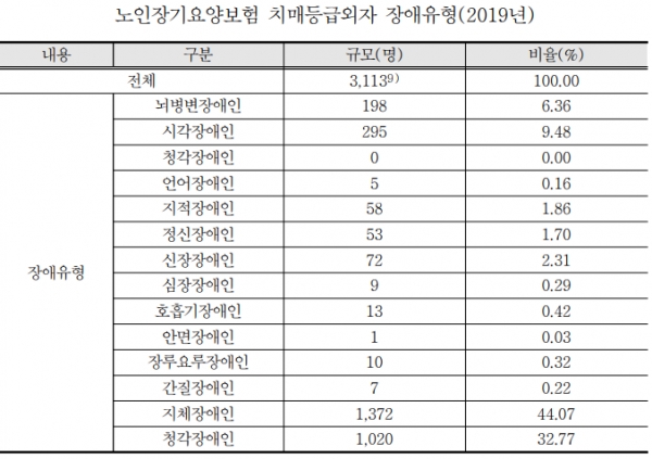 치매등급외자 중 정도가 심한, 심하지 않은 장애등급을 받은 3,113명을 대상으로 장애유형도 분석했다.