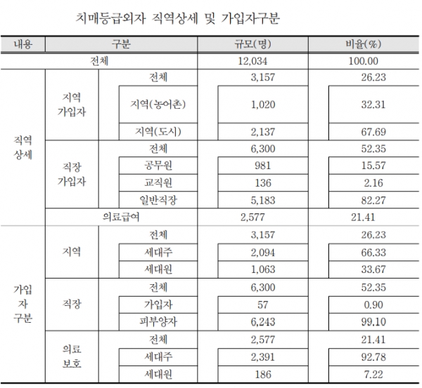 치매등급외자를 직역으로 나눠 살펴보면, 직장가입자가 6,300명(52.35%), 지역가입자 3,157명(26.23%), 의료급여 2,577명(21.41%) 등이었다.