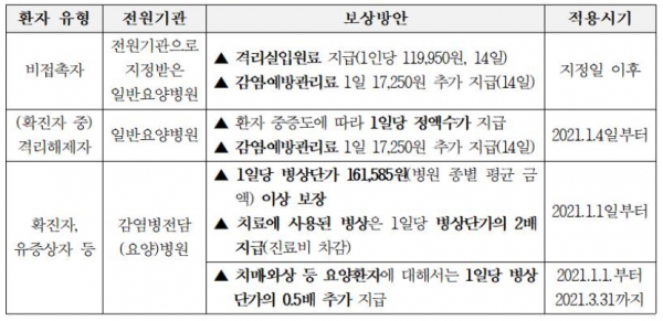 감염병전담요양병원은 ▲1일당 병상단가 16만1,585원 이상 ▲치료에 사용된 병상은 1일당 병상단가 2배 지급 ▲치매·와상 등 요양환자에 대해서는 1일단 병상단가의 0.5배 추가 지급 등이 보상된다.