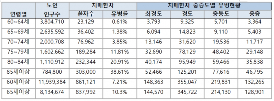 자료에 따르면, 2020년 65세 이상 노인 인구는 총 813만으로 집계됐다. 이 중 치매환자는 83만7,992명이었으며, 유병률은 10.3%였다.