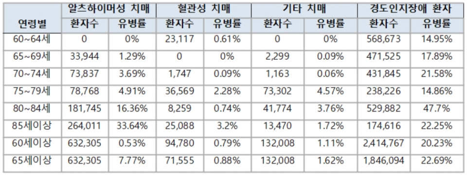 치매 유병률은 연령 증가와 비례했다. 60~64세 유병률은 0.61%, 65~69세 1.38%, 70~74세 3.85%, 75~79세 11.81%, 80~84세 20.91%, 85세 이상은 38.61%였다.