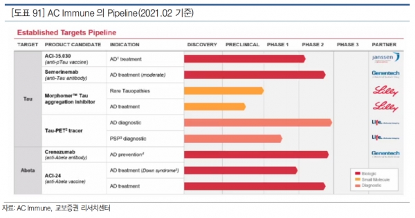 최근 발표에 따르면 AC이뮨의 새로운 파이프라인은 타우 백신 ACI-35, TDP-43 항체, a-syn 표적 저분자 화합물 등이다.