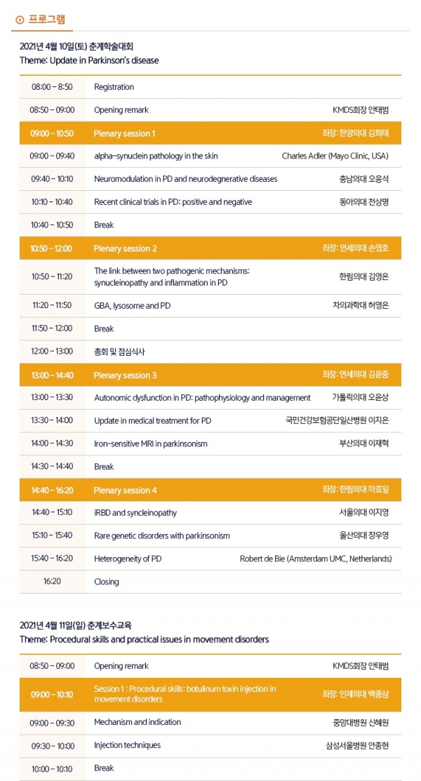 춘계학술대회와 춘계보수교육은 10일과 11일 양일에 걸쳐 진행되며, 병리, 임상형, 뇌영상, 유전자 등 파킨슨병 최신지견을 주제로 진행된다. 사전등록은 오는 4월 4일까지 마감된다.