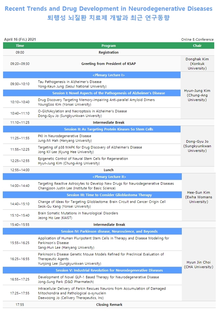 이번 학술대회는 퇴행성 뇌질환 치료제 개발과 최근 연구동향(Recent Trends and Drug Development in Neurodegenerative Diseases)을 주제로 진행된다.