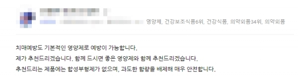 문제는 치매 예방이라는 문구를 표기-사용할 수 없음에도 본문 내용이 아닌 판매글에 이를 교묘하게 게재하면서 활용하고 있다는 점이다.