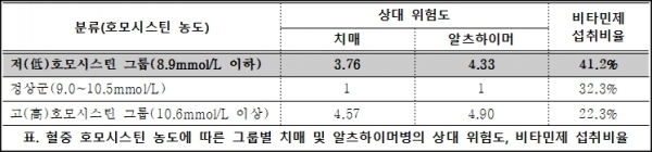 저호모시스틴혈증이 높은 비타민제 섭취율과 관련이 있다는 점도 주목할 만하다. 저호모시스틴 그룹의 비타민제 섭취율은 41.2%에 달해 전체 연구 대상자(28.4%)보다 크게 높았으며, 특히 비타민 B군인 ‘엽산’과 ‘비타민 B12’의 체내 농도가 높을수록 호모시스틴 수치가 떨어지는 것으로 확인됐다.