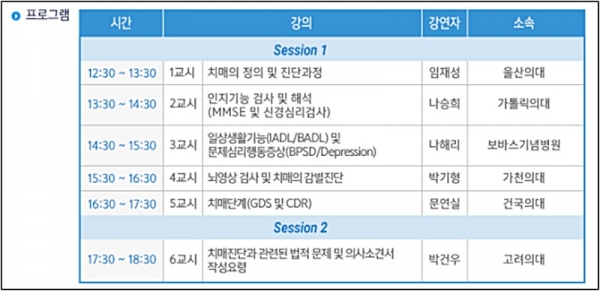 해당 교육은 치매특별등급용 의사소견서 발급하려는 전문의-일반의 대상 교육이며, 총 6시간의 강의를 이수해야 한다.