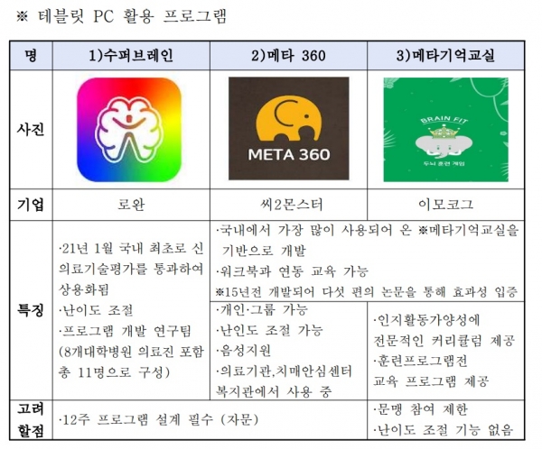 예방 프로그램은 경기도 61개 복지관을 대상으로 사업 설명회를 개최하고, 설문 조사를 통해 선택할 예정이다. 현재 경쟁 프로그램은 로완의 슈퍼브레인과 씨2몬스터의 메타360, 이모코그의 메타기억교실 3가지다.