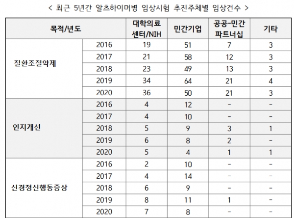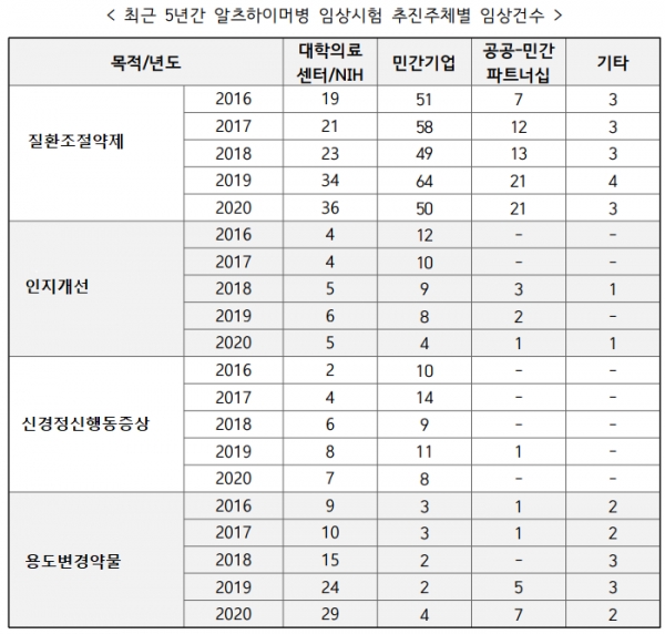 신경정신행동증상 치료를 목표로 하는 약제도 마찬가지였다. 2016년 민간기업이 10개 임상을 주도했으나, 2020년에는 8개로 줄었다. 반면 대학의료센터는 2개에서 7개로 늘었다.