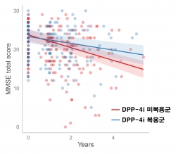 간이 정신 상태 평가에서는 DPP-4 억제제를 복용한 당뇨 알츠하이머병 환자군은 매년 인지점수의 악화속도가 0.87로 확인됐다. 반면 DPP-4 억제제를 복용하지 않은 당뇨 알츠하이머병 환자군에서는 매년 인지점수가 1.65 감소하는 것으로 나타났다. DPP-4 억제제를 복용한 환자군이 매년 인지점수 감소가 0.77 정도 천천히 진행된 것이다.