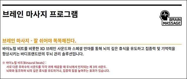 바디프랜드는 ‘안마의자 아제라 플러스 사용 설명서’에서, 아제라 플러스에 탑재된 ‘브레인 마사지 프로그램’은 “바이노럴 비트를 비롯한 XD 브레인 사운드와 스페셜 안마를 통해 뇌의 깊은 휴식을 유도하고 집중력 및 기억력을 향상시키는 바디프랜드만의 두뇌 관리 솔루션이라고 설명하고 있다.