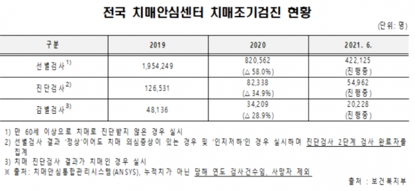 보건복지부가 국정감사 자료로 남인순 의원에게 제출한 ‘전국 치매안심센터 치매조기검진 현황’에 따르면, 코로나19 팬데믹 전인 2019년 선별검사를 받은 인원이 195만 4,249명이었으나, 2020년엔 82만 562명으로 무려 58%가 급감했다.