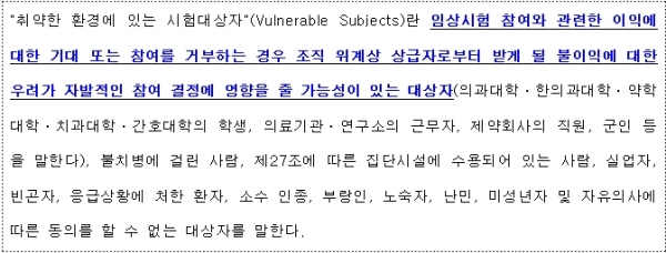자사 직원을 대상으로 진행한 시험은 ‘생명윤리 및 안전에 관한 법률’과 ‘동법 시행규칙’상 ‘취약한 연구 대상자’에 해당하며, 사전에 이를 밝히지 않은 점은 법률 위반행위에 해당한다.