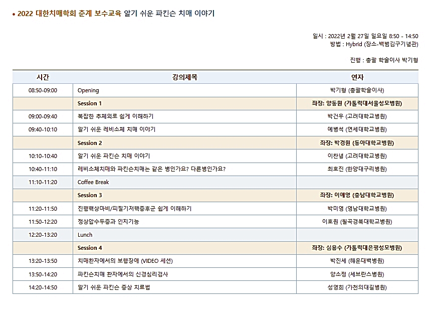 대한치매학회가 오는 2월 27일 백범김구기념관에서 '2022년 대한치매학회 춘계보수교육'을 개최한다.
