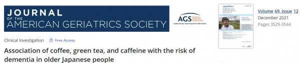 <논문> Matsushita N, Nakanishi Y, Watanabe Y, Kitamura K, Kabasawa K, Takahashi A, Saito T, Kobayashi R, Takachi R, Oshiki R, Tsugane S, Iki M, Sasaki A, Yamazaki O, Watanabe K, Nakamura K. Association of coffee, green tea, and caffeine with the risk of dementia in older Japanese people. J Am Geriatr Soc. 2021 Dec;69(12):3529-3544. doi: 10.1111/jgs.17407. Epub 2021 Oct 8. PMID: 34624929.