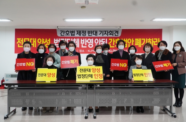 최근 보건의료 10개 단체는 간호법 저지 공동비대위 출범식을 갖고 간호법 입법 중단 촉구 입장과 함께 대응 공동전선을 구축했다. 참여 단체는 의사협회, 병원협회, 치과의사협회, 간호조무사협회, 응급구조사협회, 요양보호사중앙회, 노인장기요양기관협회, 노인복지중앙회, 재가노인복지협회, 재가장기요양기관협회 등이다.