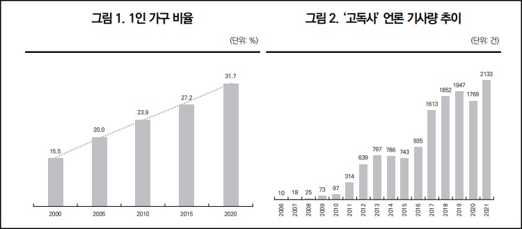 특히 2020년 기준 1인 가구는 10가구 중 3가구에 이르며, 연령이 높아질수록 고립 인구는 가파르게 증가하는 상황이다. 이에 중장년과 노인 인구의 고독사 비율도 덩달아 늘어나는 중이다.