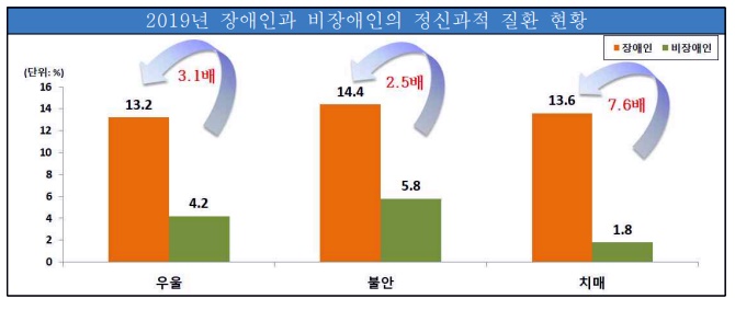 지난 2019년 기준 장애인의 주요 정신과적 질환을 보면 우울(13.2%), 불안장애(14.4%), 치매(13.6%)인 반면 비장애인은 우울(4.2%), 불안장애(5.8%), 치매(1.8%)로 각각 3.1배, 2.5배, 치매 7.6배의 차이를 보였다.
