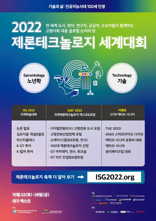 국제제론테크놀로지학회가 주최하는 제론테크놀로지 세계대회가 오는 10월 22일부터 28일까지 대구 엑스코에서 개최된다.