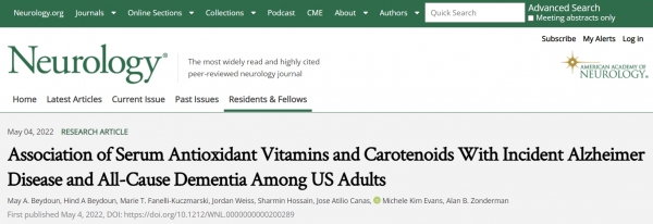 <논문> Association of Serum Antioxidant Vitamins and Carotenoids With Incident Alzheimer Disease and All-Cause Dementia Among US Adults. May A. Beydoun, Hind A Beydoun, Marie T. Fanelli-Kuczmarski, Jordan Weiss, Sharmin Hossain, Jose Atilio Canas, Michele Kim Evans, Alan B. Zonderman. Neurology May 2022, DOI: 10.1212/WNL.0000000000200289.