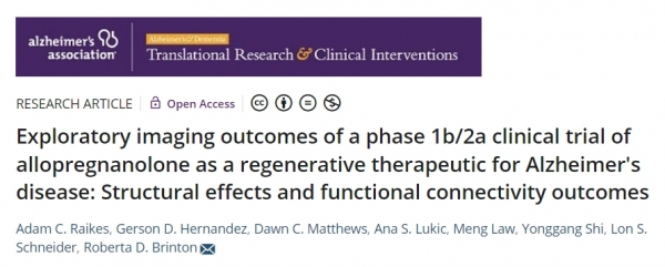 <논문> Raikes AC, Hernandez GD, atthews DC, et al. Exploratory imaging outcomes of a phase 1b/2a clinical trial of allopregnanolone as a regenerative therapeutic for Alzheimer’s disease: Structural effects and functional connectivity outcomes. Alzheimer’s Dement. 2022;8:e12258. https://doi.org/10.1002/trc2.12258.