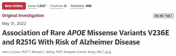 <논문> Le Guen Y, Belloy ME, Grenier-Boley B, et al. Association of Rare APOE Missense Variants V236E and R251G With Risk of Alzheimer Disease. JAMA Neurol. Published online May 31, 2022. doi:10.1001/jamaneurol.2022.1166.