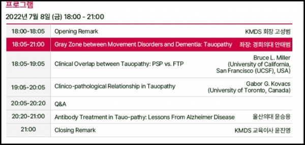 주제는 'Gray zone beetween movement disorders and dementia: tauopathy(운동장애와 치매의 중간 영역: 타우병증)'으로 마련됐다.