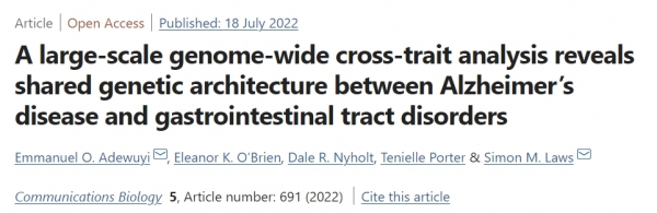 <논문> Adewuyi, E.O., O’Brien, E.K., Nyholt, D.R. et al. A large-scale genome-wide cross-trait analysis reveals shared genetic architecture between Alzheimer’s disease and gastrointestinal tract disorders. Commun Biol 5, 691 (2022). https://doi.org/10.1038/s42003-022-03607-2.